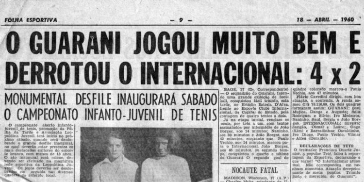 Bagé, 17 (Do Correspondente) – O esquadrão do Guarani, fazendo uma grande exibição de football, conquistou fácil triunfo, esta tarde, no Estádio Estrela D’Alva, frente ao Esporte Clube Internacional, da Capital do Estado, pela contagem de quatro tentos a dois.