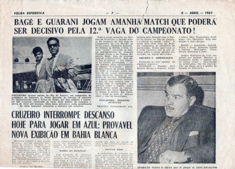 SAULZINHO chegou ontem, do Rio de Janeiro, em companhia do presidente do Guarani, sr. Paulo Barcelos da Silveira. O atacante foi transacionado com o Vasco da Gama, por dois milhões e trezentos mil cruzeiros, recebendo de luvas meio milhão de cruzeiros e oferta de vinte mil mensais. Além disso, perceberá, como gratificação do clube bageense, seiscentos e noventa mil cruzeiros.